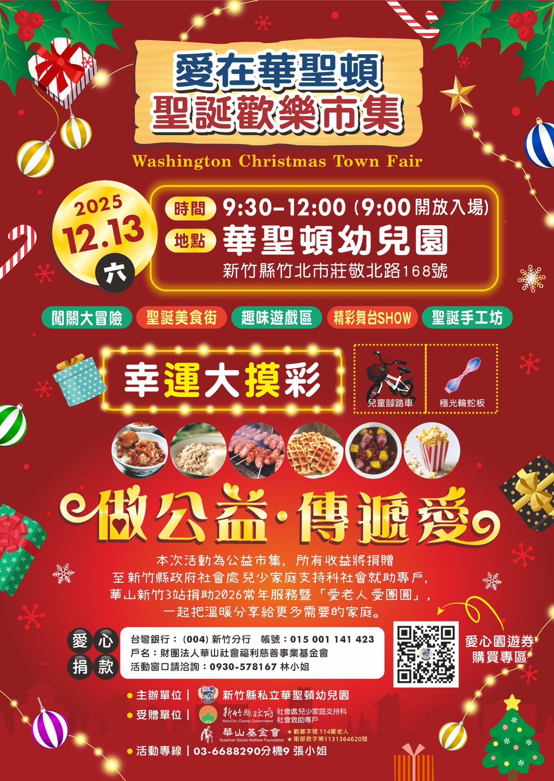 最溫暖、最有愛的聖誕派對來嚕~一起吃美食、玩遊戲、看表演、做公益❤️📅114/12/13(六)9:30–12:00📍華聖頓幼兒園(竹北市莊敬北路168號)🌟當天有🤩💚美食市集~滷味、鬆餅、香腸、甘蔗青茶、爆米花香氣滿滿💚遊戲闖關~幸運大摸彩、親子手作、舞台表演💖公益傳愛行動所有收益將捐贈予「新竹縣社會處兒少家庭支持科」及「華山基金會」讓愛從華聖頓出發,傳遞溫暖🌟🎟立即預購12/13愛心園遊券👉🔗 https://forms.gle/8iYHQz6LenNvaxjb7