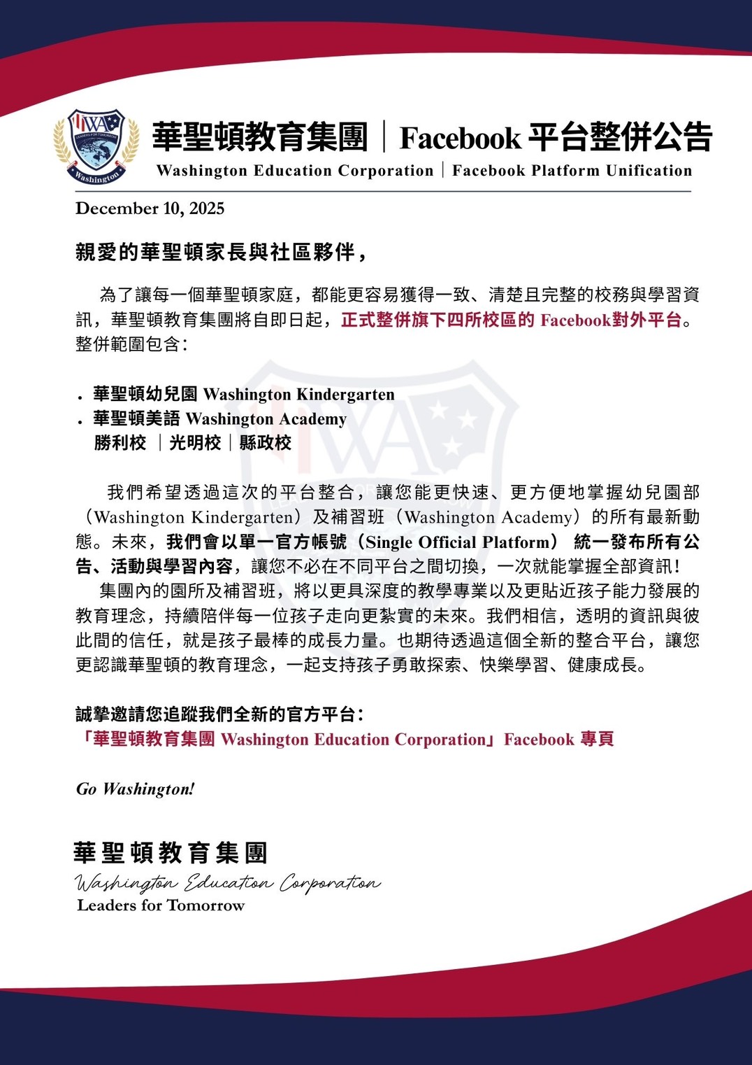 為讓您更快速、清楚掌握校園每一刻的精彩,即日起(2025/12/10),華聖頓教育集團正式將四校 Facebook 整併至官方帳號!所有最新消息與校務資訊都會在這裡一次看齊!